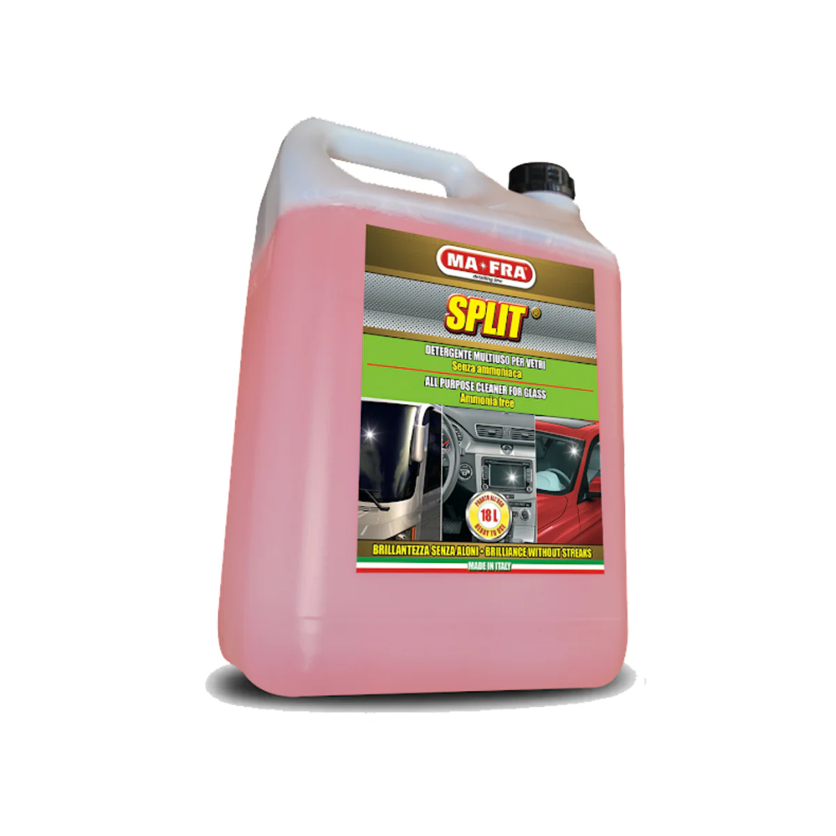 SPLIT er en vindusvasker med en balansert formel av alkoholer og vegetabilske overflateaktive stoffer, som sammen bygger et aktivt skum som meget effektivt løser opp de fleste typer fett og smuss. SPLIT fjerner nikotin, sot, insekter etc. uten å etterlate rester. Kan brukes på glass, speil, plast og alle andre vaskbare overflater. Etterlater en frisk duft. Sikker på LCD, etc.